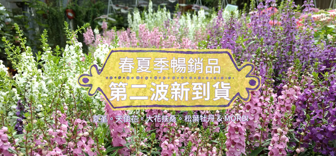 春夏季暢銷商品第二波,有如黑莓果醬的紫黑色日日春、歐式華麗的多色大岩桐、好種易管理的天使花、耀眼無比的大花扶桑、有如夏日甜點的松葉牡丹、可愛的夏堇,哪一款是你望穿秋水等待已久的春夏季草花。