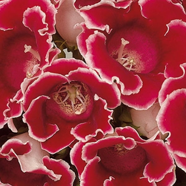 丹麥進口種子F1種子,花色為紅色鑲白邊。播種到開花約16~22週。植株緊密,葉子小,花莖短,花朵高舉於葉面上,是永不褪流行的大岩桐品種。花朵為單瓣,花大,鐘型。大岩桐為多年生草花,地下部會有球莖,即使地上部枯萎,球莖亦能再萌發新枝。適合以4~5吋盆種植單株。如何種植栽培要點可參考延伸閱讀。