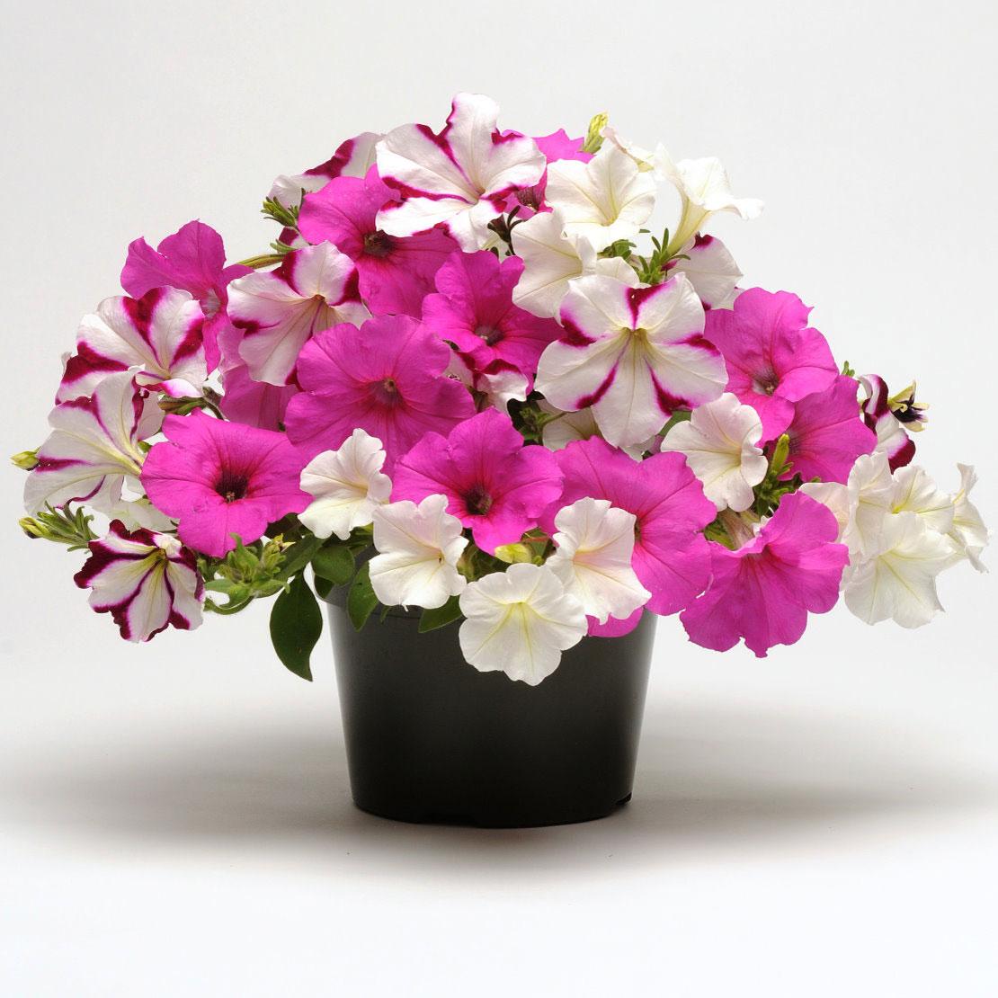 美國進口混合品種組合種子。為2015年新推出的組合種子,播下一粒粉衣種子,即可同時擁不同花色之匍匐性矮牽牛,一粒組合種子內含浪花-酒紅星、浪花-桃、浪潮-白三個花色,花期可從春季持續至夏末。1粒粉衣種子就可長滿6~8吋盆,播種後約8~12週就會開始開花,非常適合盆植、吊盆栽培、組合盆栽、花圃栽培等。