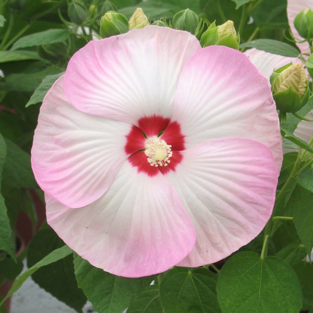 株高僅50公分,花徑可達23公分!花期可持續整個夏季,白色花瓣邊緣有漸層似的粉紅色暈染,十分高雅迷人。不論是以盆子栽種,或是栽植於花壇中,都很適合。