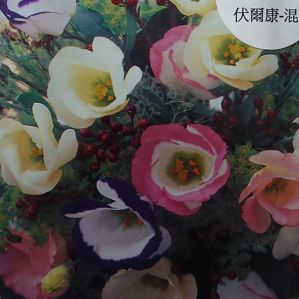 日本進口繪袋種子。F1中生品種,生育旺盛、分枝多。花朵杯型;中小輪,花瓣厚、花莖硬挺耐儲運,瓶插壽命長,混合了綠、白鑲粉邊、白鑲藍邊、香檳四種清新素雅的花色,適合作為切花栽培;盆植也可欣賞其美麗婀娜之花姿。