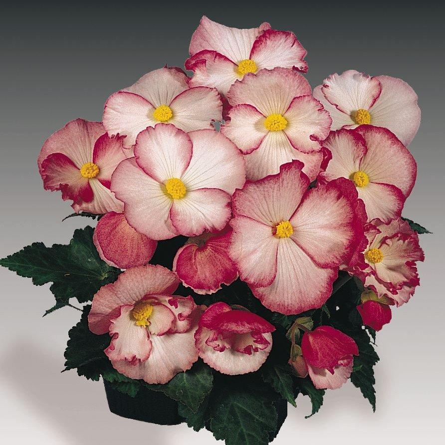 德國進口粉衣種子。單瓣大花的球根海棠,開花數多且花朵平整,花色淡粉搭配深桃滾邊十分柔美,與濃綠的葉色形成強烈的對比,播種到開花需18-20週,適合以花盆或吊籃栽培。