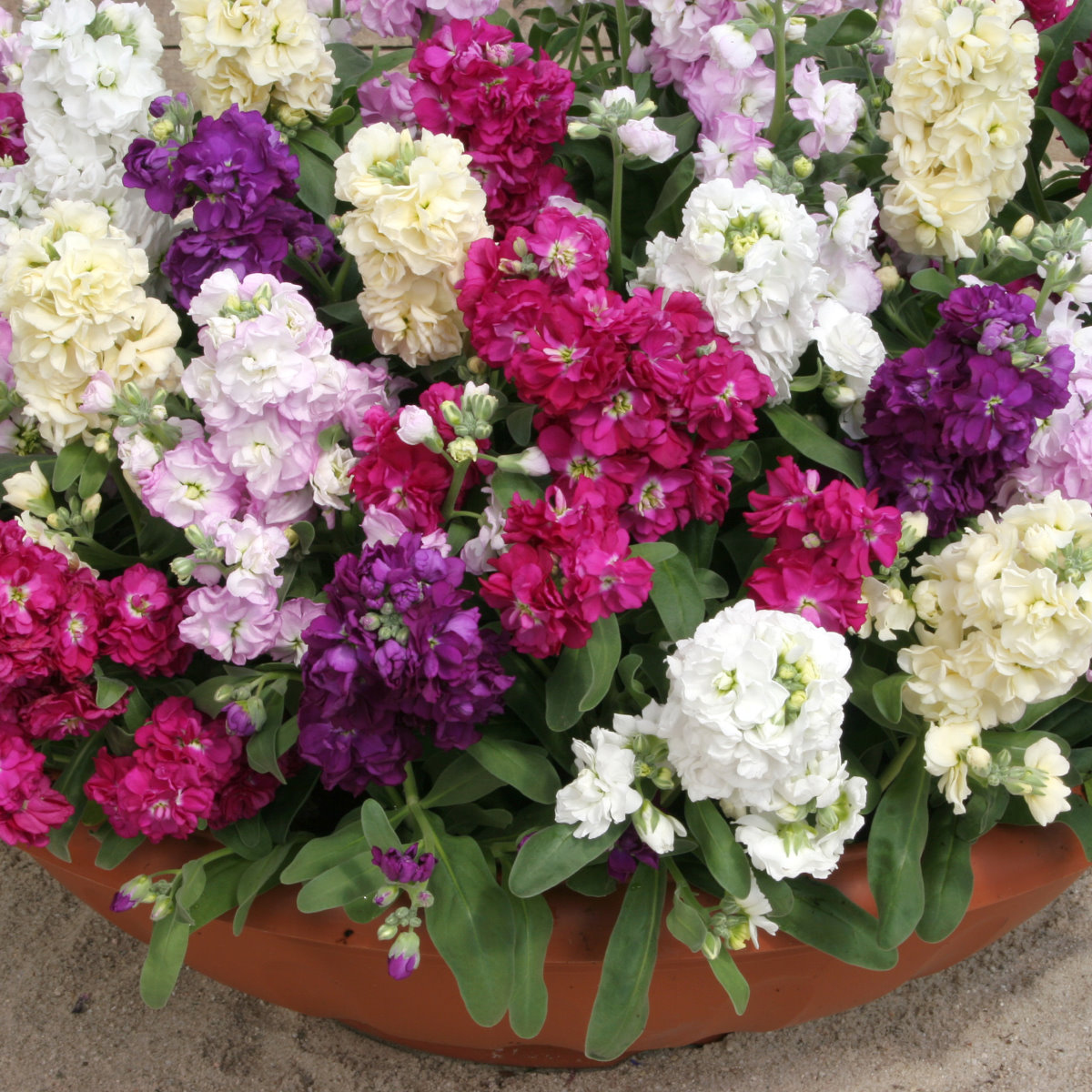 美國進口高品質種子。混合花色紫羅蘭品種,花色有白、黃、粉、紫、桃共5色混合。花朵型態有重瓣及單瓣,約有50~60%的機率開出重瓣花。植株低矮,分枝性佳,開花期長,花朵具香味,適合盆植或種植於花壇、花圃、花槽等。盆植時建議以4吋盆栽培單株,或多株合植於大盆中。