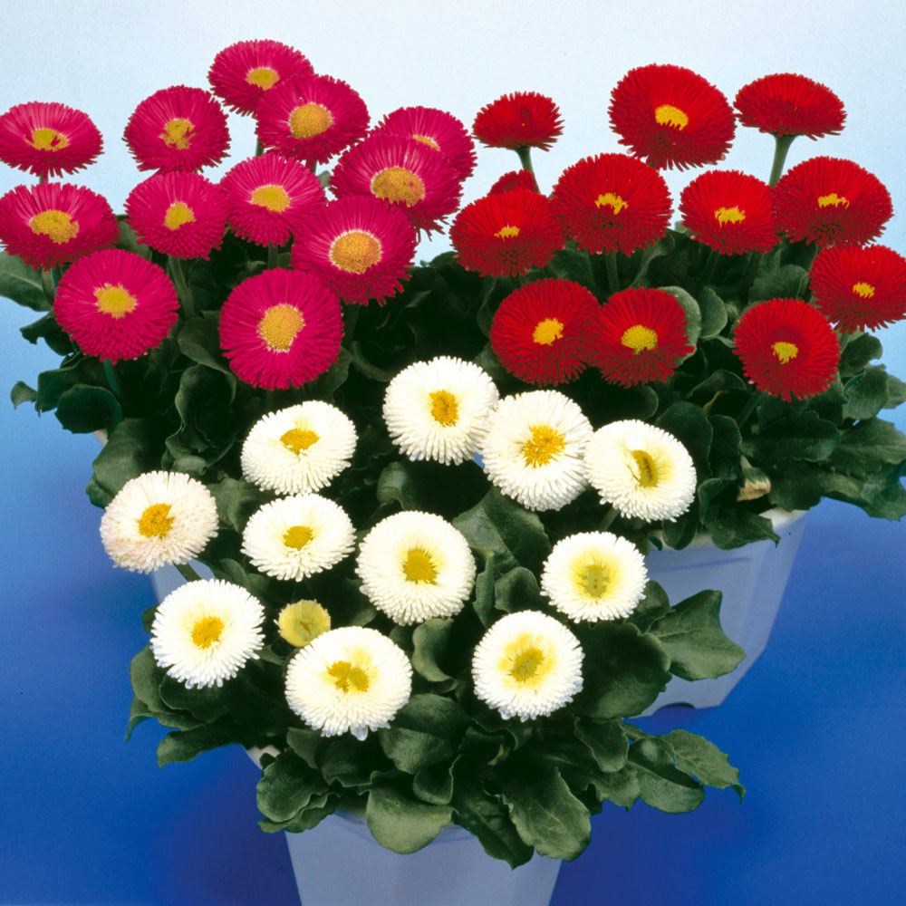 日本進口高品質種子。是較早開花的雛菊品種,播種後約80~100天即可開花。植株低矮,管狀花序排列成半球型,花徑約3公分左右,開花性佳。花色有白、粉桃、紅3種花色,非常適合盆植、花槽、花壇栽培,也可搭配其它涼季草花如三色堇、香堇菜、葉牡丹等一起搭配栽植。盆植時建議以4吋盆栽培單株,或多株合植於大盆中。可栽培於全日照或是有部分遮蔭的環境。