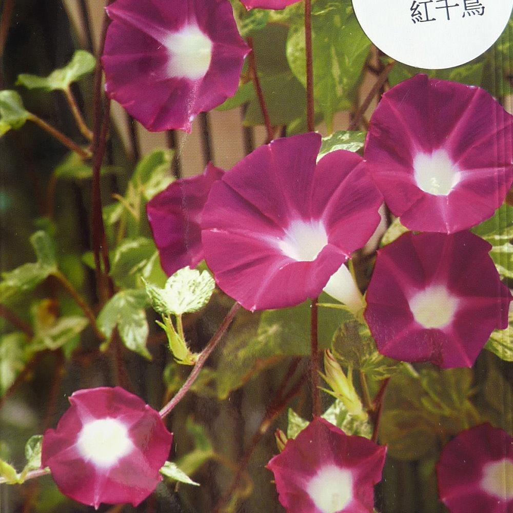 株高約為50cm,以前從來沒有出現過,極為珍貴的懸垂性朝顏,花朵為小輪的紅花,葉子為小型葉,葉子上有淺綠色斑塊,是賞花、賞葉皆宜的品種。花期長,每一段莖節幾乎都可以開花,是一個多花的品種,種於吊盆內最為合適。