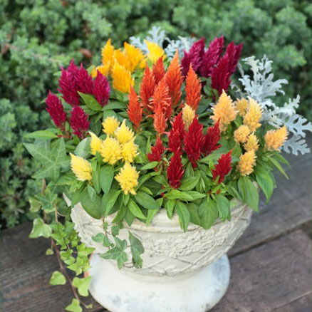 日本進口高品質種子。為2013年推出的新品種,植株非常低矮的羽毛雞冠花品種,植株自然低矮結實,播種後約7~10週即可開花,非常適合園藝新手嚐試栽種。共有5種花色混合—淺黃、橘紅、紅、瑰紅、深黃,即使在豔陽下,花色亦不會褪色,單色種植或是混色栽培皆適宜。適合盆植或是庭園花圃、窗台花槽栽植。盆植時可以2.5吋~4吋盆栽培,盆子越小,植株越迷你;羽毛雞冠花 浴衣也適合以多粒栽培的方式栽種(建議6吋盆內播入10~12粒種子),除了可以提早開花,植株也會較矮小(方法可參考延伸閱讀-「草花迷你栽培法」一文),適合移至明亮的室內觀賞。耐暑性佳,是夏日理想的盆栽及花壇草花品種。