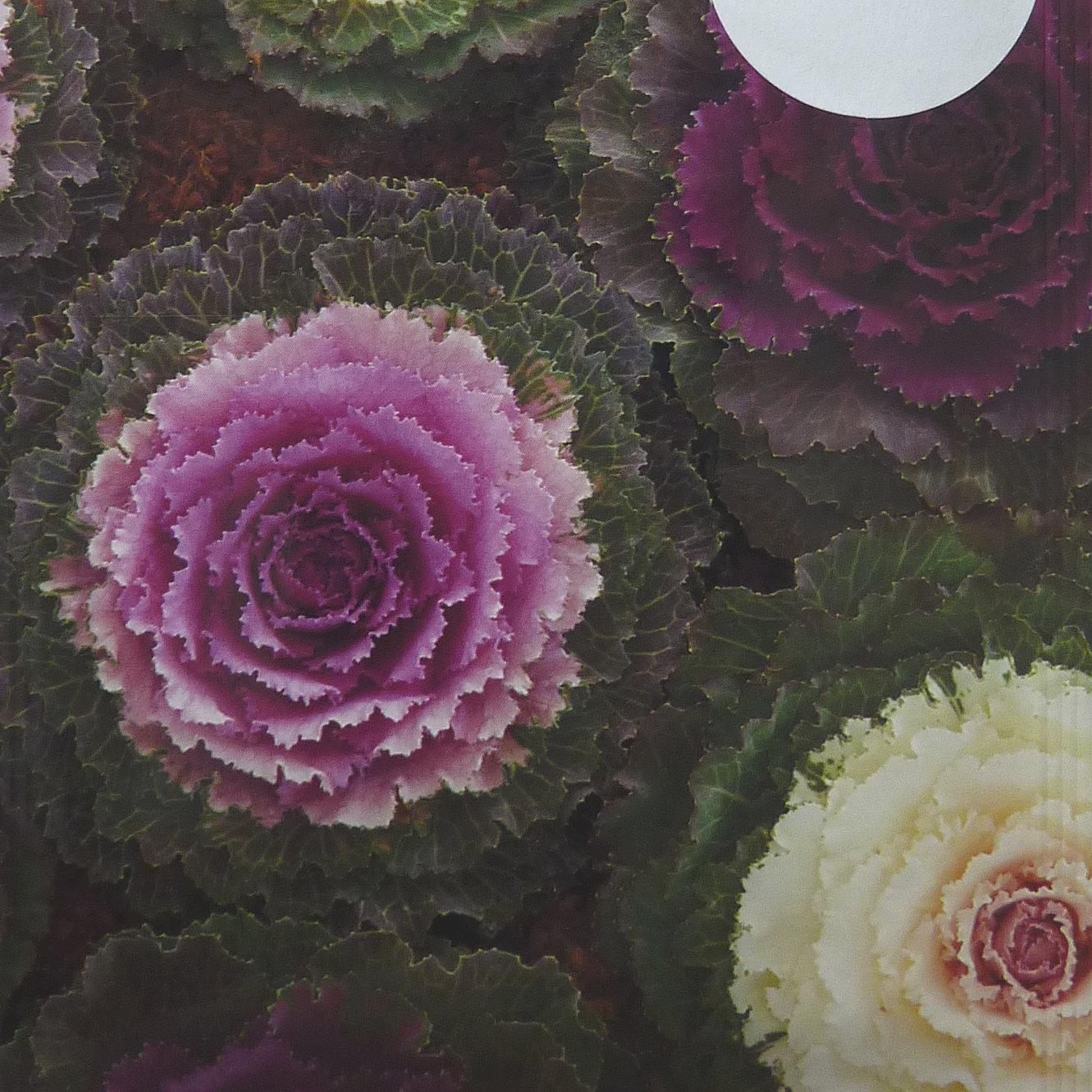 日本進口繪袋種子。F1品種,圓葉系矮性葉牡丹,生長勢整齊的小型葉牡丹品種,葉片數多;葉緣捲曲呈波浪狀,植株緊密而結實,花色包含紅、桃、白共三色混合,適合冬季花壇佈置或與其他草花混植,是正月裡妝點門面不可或缺的花卉。