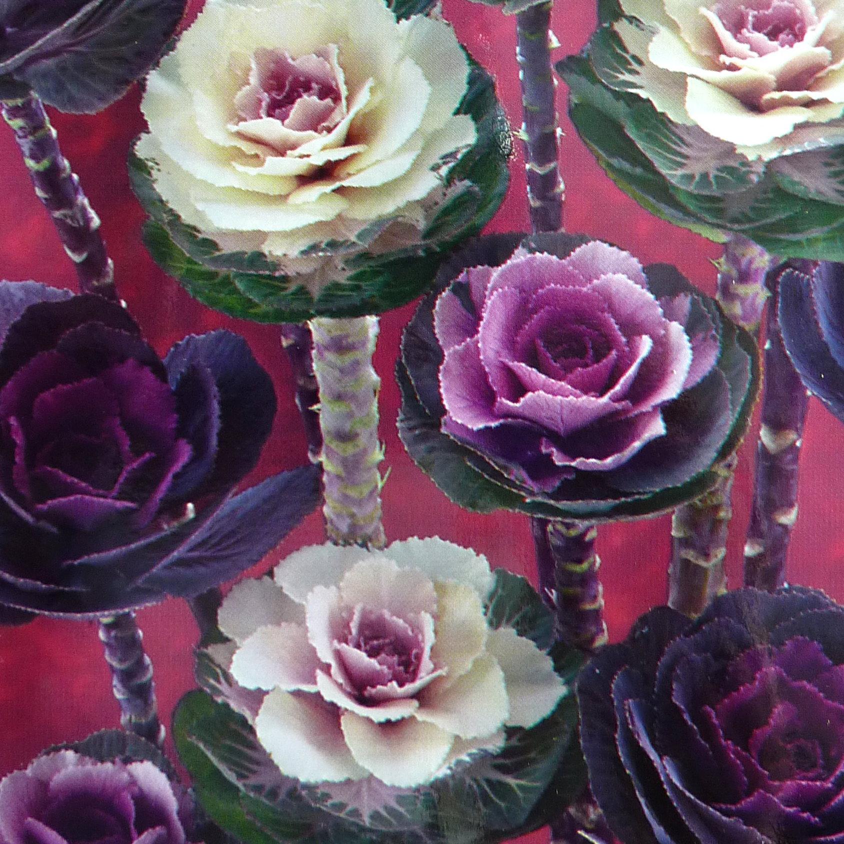日本進口繪袋種子。圓葉系高性葉牡丹,藉由低溫將單調的綠色葉片轉化成豔麗的色彩,是冬季切花中的相當受歡迎的基本款,葉色有白、粉、桃三色混合,本葉3-4枚時密植於栽培於苗床上,有助於花莖更細長且花瓣更緊密,繼而提高切花品質。