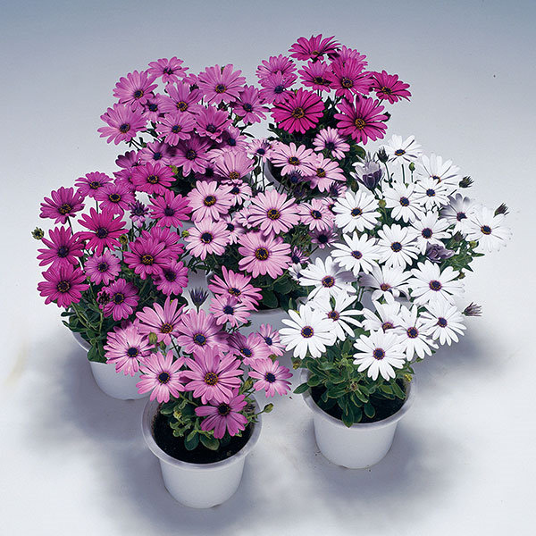 日本進口F1種子。基部分枝性強,耐寒性、耐旱性極佳,為傳統的雛菊花型,單花直徑約5-6公分,桃、白、紫、粉四種花色皆具有蔚藍的花心,多花且花期持久,適合盆植、組合盆栽、或於花壇栽培。