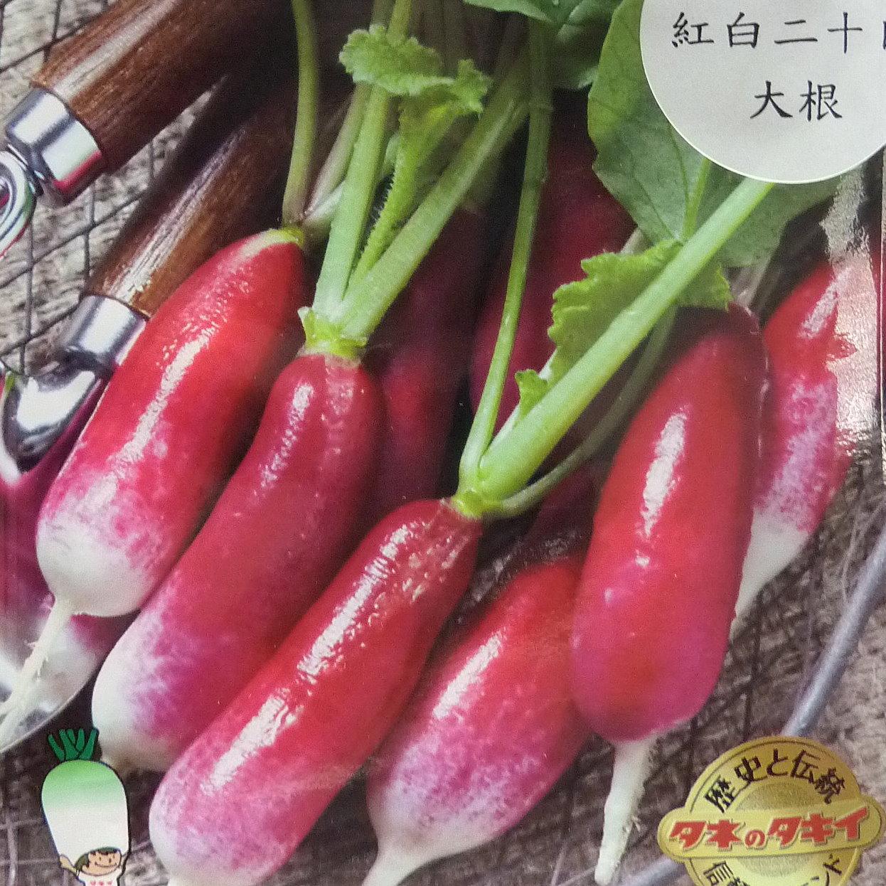 表皮紅白色的迷你種蘿蔔,在適當時期播種,播種後約20日,根長度約4公分,直徑約2公分左右時即可採收,栽培容易.肉質純白,口感清脆,做沙拉或醃漬都相當適合;葉子也柔軟可食。