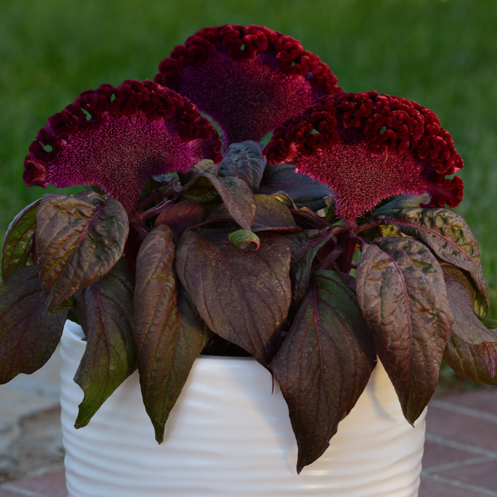 美國進口種子。矮性頭狀雞花品種,播種至開花約9-12週。擁有強壯的莖幹、血紅色的葉片;花色為新穎的深紫色(光線不足時葉色偏綠/花色偏紅)、花頭巨大且著生於頂端,植株對於炎熱及惡劣氣候的有著絕佳的耐受性。種種優點為德古拉開拓出一條除了應用於盆花外更需要能長期觀賞的地景花卉之路。